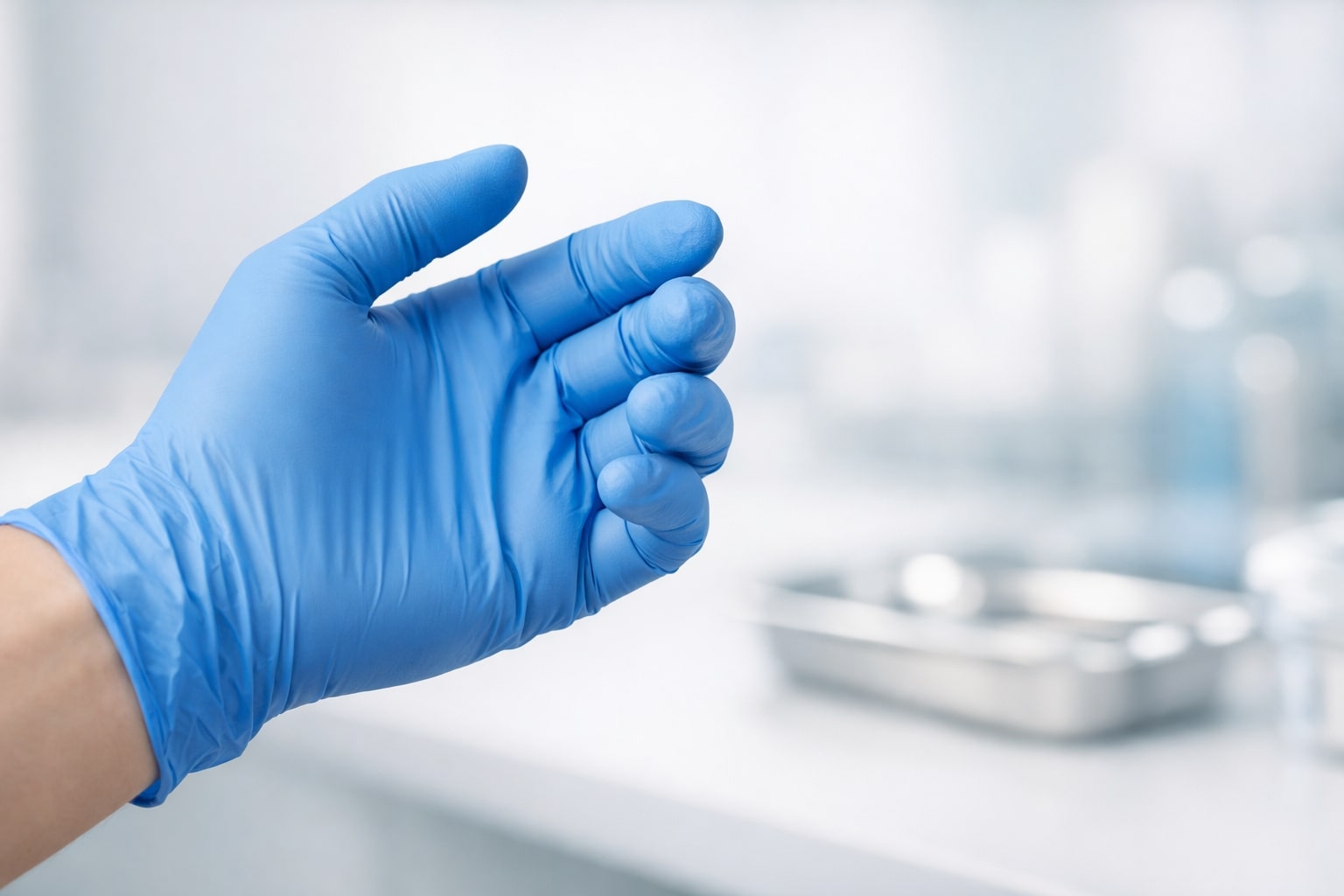 Nitril‑Untersuchungshandschuhe für medizinische Zwecke – getragen an der Hand des Untersuchers, um Kontamination zwischen Patient und Untersucher zu verhindern.
